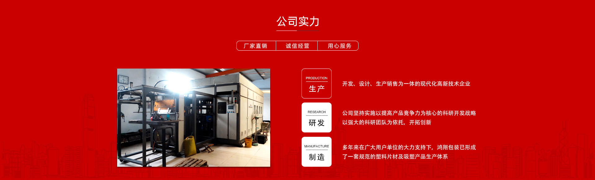 平原縣鴻翔包裝制品有限公司是一家大型生產塑料片材及吸塑產品企業,本公司投資引進電腦自動塑料氣壓成型機,壓片機,全自動高速吸塑機,率先開發(fā)生產PVC片材,PET片材,PS片材,PP片材等,鴻翔是國內先進的生產廠家之一。本公司產品廣泛應用于醫(yī)藥、食品、化妝品、日用品、農業、五金、電子元件、工藝品等行業,也可根據客戶需求自行設計制作模具。本公司技術力量雄厚,生產設備工藝先進。我們秉承用戶至上的經營宗旨,竭誠為您服務。